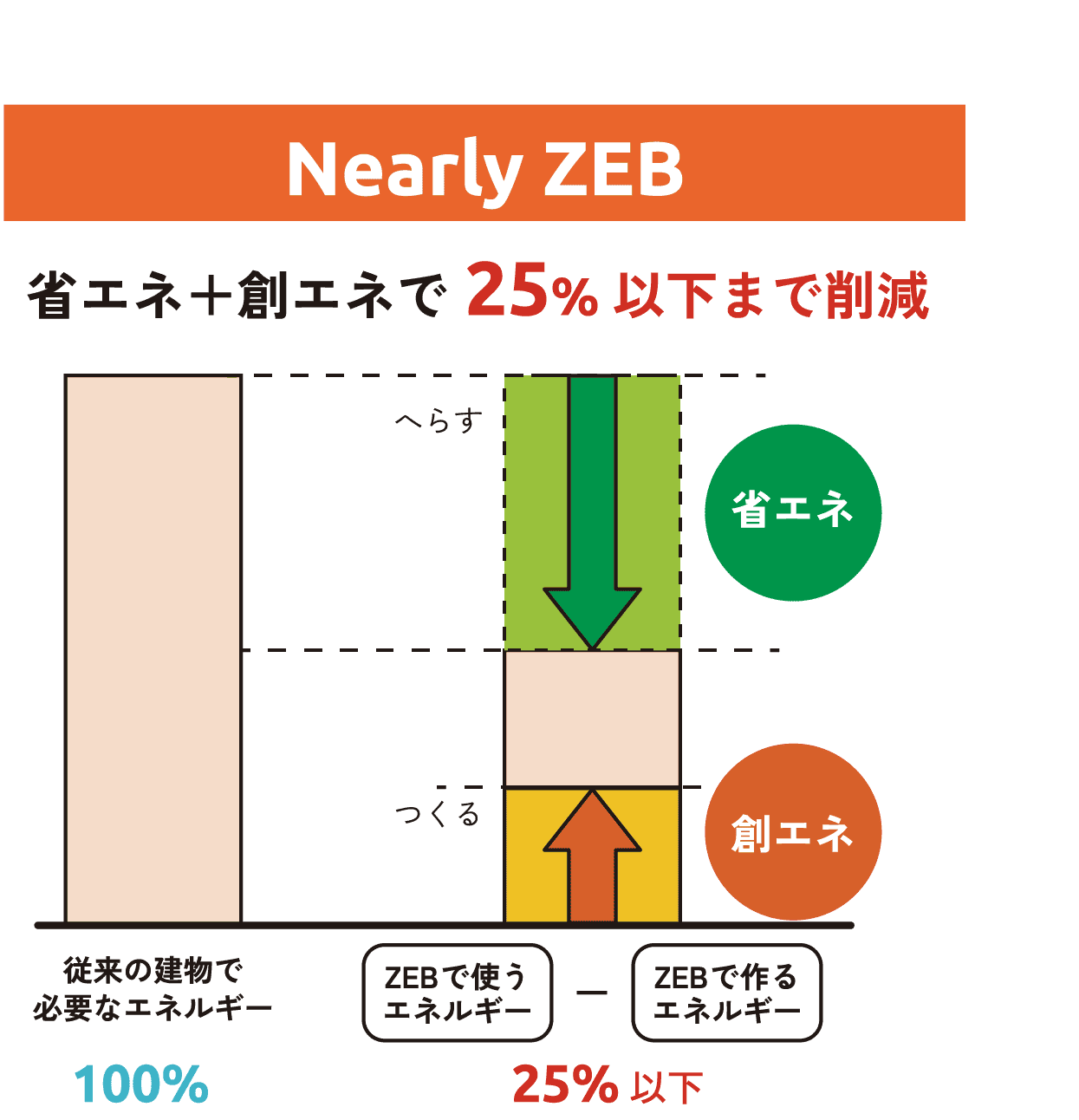 建物内のエネルギー消費量を完全にゼロにすることはできませんが、省エネによって使うエネルギーをへらし、創エネによって使うエネルギーをつくることで、エネルギーの消費量を正味(ネット)でゼロにすることができます。